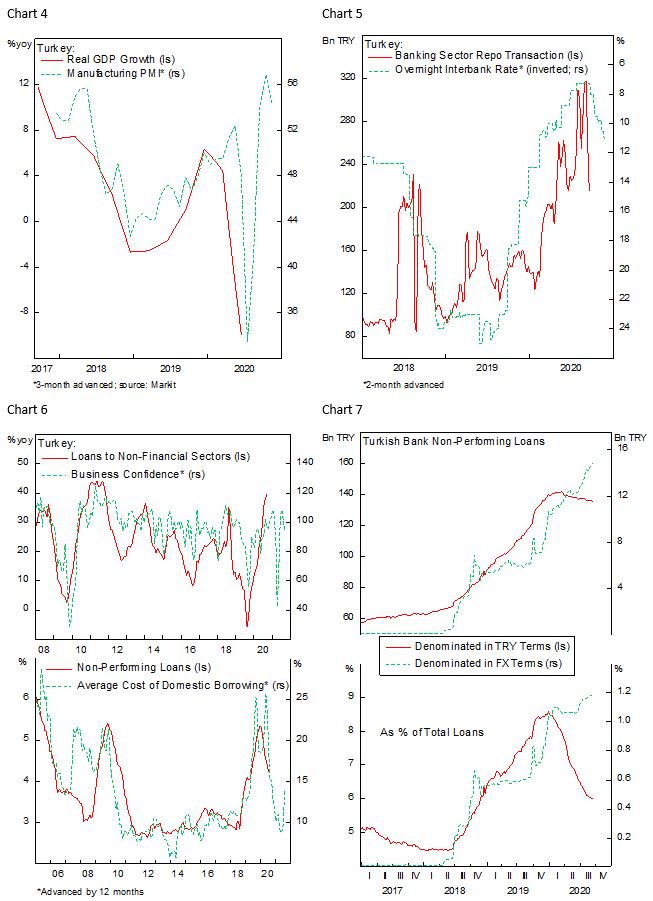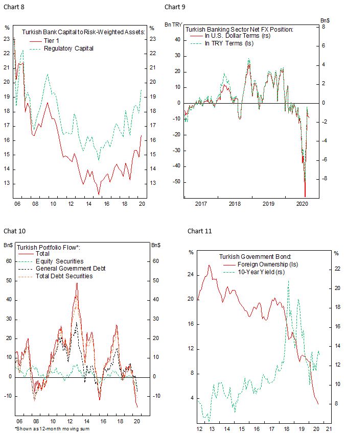 Second, the tightening of interbank and repo rates increases the banking sector funding cost and will force banks to curtail credit, which will have a significant impact to the real economy and the banking sector (Chart 5), in which the latter often triggers a financial crisis. Credit growth will likely moderate going forward and non-performing loans will increase at the margin (Chart 6). So far, the combination of weakening lira and a domestic credit boom has resulted in TRY-denominated NPL going down from its 2019 peak while FX-denominated NPL has steadily risen, albeit at a still low rate (Chart 7). Should the CBRT continue to hike its policy rate, which we think will be the case, we may see a reversal of the trend in TRY and FX-denominated non-performing loans. The saving grace is that Turkish banks are well capitalized, and its net foreign exchange position has drastically improved from the distressing level months ago (Chart 9)