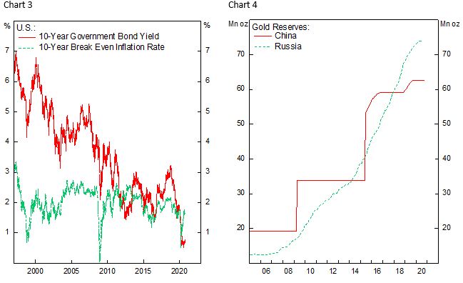 - Precious metals act as a substitute for hedge assets, such as U.S. Treasury, which has experience reduced hedging capability due to its record low yields. Central bank reserves have been slowly shifting from U.S. dollar assets, which will benefit other currencies and gold. The transition is already happening in countries that deem U.S. hostility could potentially void their claim on reserve assets, such as Russia and China. Both countries have seen a marked increase in their gold holdings volume (Chart 4).