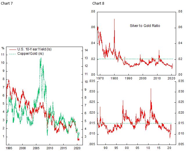 - Another force that often drive precious metals is the mania potential from an environment of low rates, easy fiscal and monetary policy. The difficulty in valuing these assets make them susceptible from forming a bubble. Currently, gold and silver price relative to U.S. money supply is still far below its mania peak in 2011 and 1980s, an argument supporting further upside of gold price in dollar terms (Chart 5 and 6).