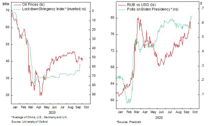 – Another risk relates to what a Biden Presidency could mean for Russia, whose probability has increased markedly. The former vice-president and Democrats have a tough on Russia policy and may put further sanctions on Russia amid its violation of international law and the suspected poisoning of Alexei Navalny, the anti-corruption activist and opposition of Putin’s regime. Although Russia has ringfenced its economy since 2015 amid its annexation of Crimea, the Rubble and current equity valuation will be under pressure on the news of a renewed international sanctions.