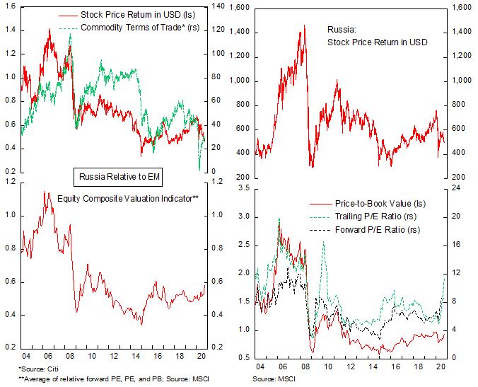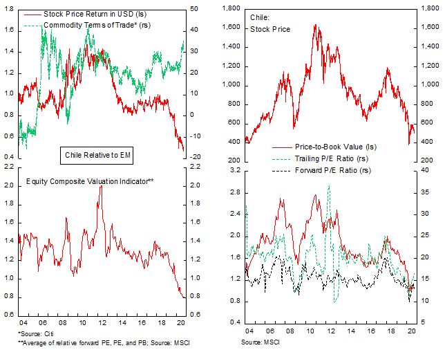 + Colombian stocks and the peso lag the recovery in oil prices, mostly due to heightened risk premium demanded by investors amid the poor health care situation across major Latin American countries. Valuation of Colombian equities remain cheap on a stand-alone basis and is on its historical low relative to EM. A recent downtrend in the country’s infection cases should allow the government to ease its lockdown restriction gradually in the coming months, allowing greater economic activity to rebound.