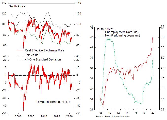 + The country has been bombarded by bad news even prior to the pandemic, which is increasingly priced in the asset market. Inflation has remained subdued despite the Rand weakness, which allows the SARB to ease monetary policy this year. The ZAR is cheap, according to our fair value assessment, and an improving outlook will inevitably lift high-beta Latam currencies and the Rand.