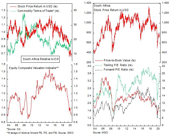 + The underperformance of South African equities is well-advanced, and a rebound is due. The equity market is trading at 10.5x forward earnings, the lower end of its long-term average. The country’s term of trade has improved of late, supported by rising gold and commodity prices, which should be a tailwind to profits (10% of its equity index is gold miners and 23% is classified as materials).