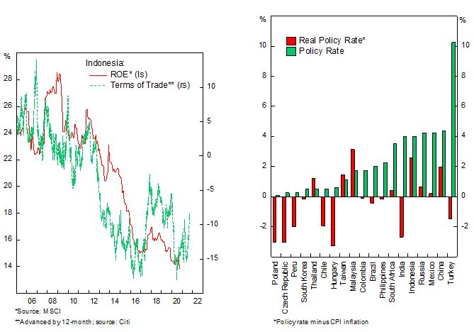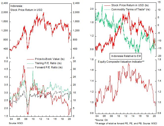 + Indonesian equity valuation has derated significantly in the past decade due to the cyclical decline in commodity prices and profits. This has removed the froth in its stock valuation, which currently trading at a slight discount relative to EM benchmark, at a time when the country’s terms of trade have been improving. The prospect of a further dollar weakness and accelerating growth in China will likely further boost commodity prices in the medium term and benefit commodity-exporter countries, including Indonesian equities.