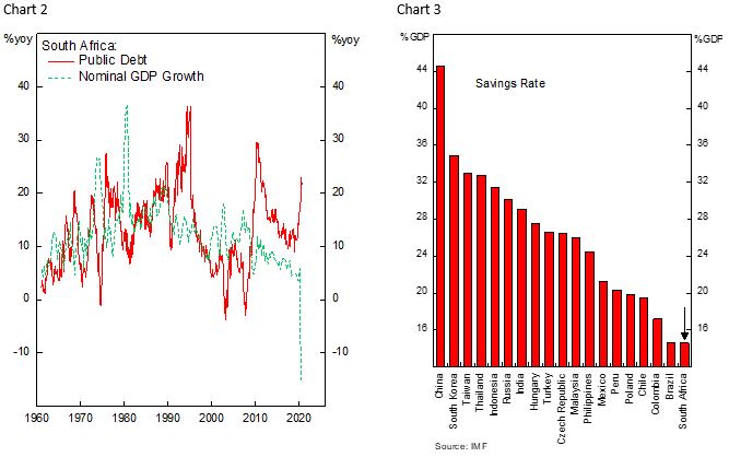 South African government fiscal situation turned from bad to worse this year amid a shortfall in tax revenue and increase in spending to support growth (Chart 1). The government’s revision to its budget in June mainly reflects a shifting of its spending, i.e. delaying projects to 2021/2022 or beyond while prioritizing funds for the Covid-19 fiscal relief package (Table 1-3). Although the aide to the economy by increasing transfer payment to the poor and unemployed is welcome and should provide a floor to growth, this come at the cost of a huge dent to the government fiscal and a delay in investments that are important for the country’s long-term growth drivers.