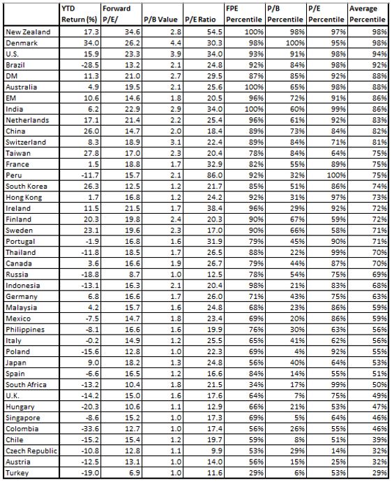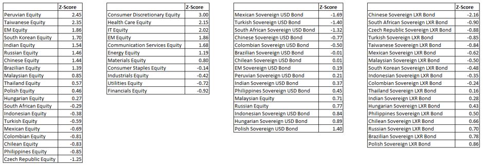 On the last note for this month, we are monitoring the Z-score (or deviation) of EM equity valuation, USD-denominated bond, and LXR-denominated bonds, and rank them from the least attractive (top) to the most attractive (bottom) from a historical perspective. This is not meant as a recommendation, but rather to see which asset market has performed best/worst relative to its 10-year period average.