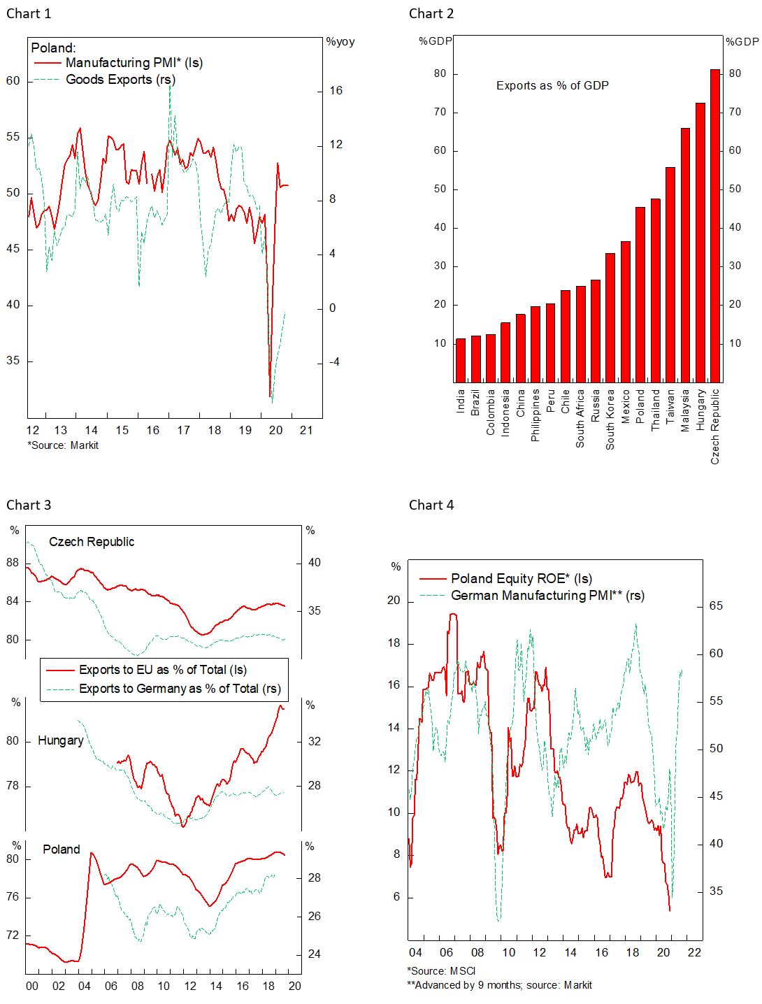 - Polish manufacturing sector and exports have both staged a V-shaped recovery despite the reintroduction of a strict lockdown across major European countries (Chart 1). As an open economy that is highly integrated with European manufacturing sector Poland has benefited from the sharp recovery of German manufacturing (Chart 2-4), which points to a much higher profitability for the country’s equity market. Moreover, new daily confirmed Covid-19 cases in Poland has come down significantly and cases across other European countries are showing signs of peaking, which will aid the recovery of its lagging service sector and retail consumption.