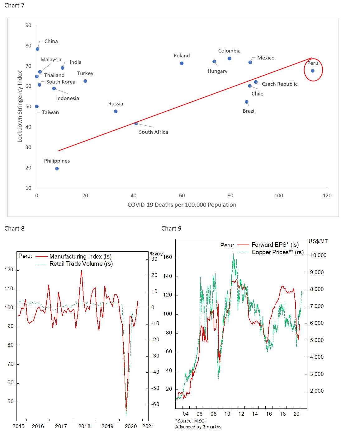 - Peru is among the worst to suffer from Covid-19 pandemic in terms of deaths per capita and economic damage (Chart 7), which make the case that a rapid distribution of an effective vaccine could help the country quickly reach the threshold for “herd immunity”, supported by the already high infection rate among large portion of the population. Currently, Peruvian manufacturing activity has rebounded above pre-pandemic level while retail trade is still slightly below last year’s level, both of which will be further aided by inoculation of the country’s citizen (Chart 8).