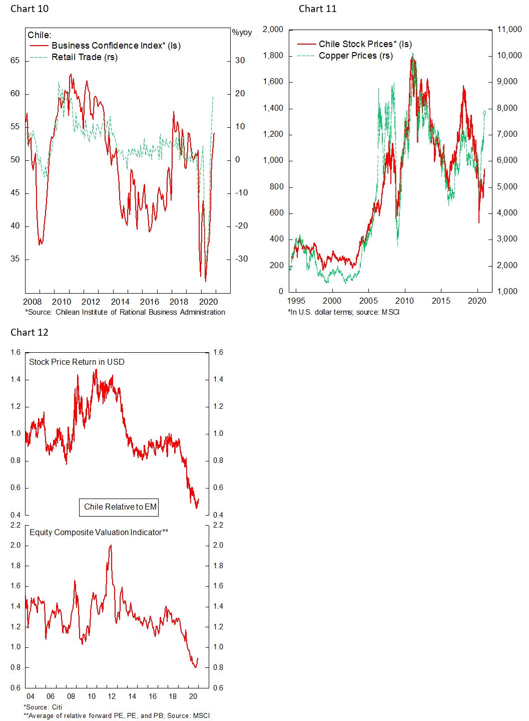 - Similar to Peru, Chile is a commodity-intensive economy, with copper accounting for over half of the country’s exports. The country will likely also benefit most from inoculation of its population, which ranks poorly in terms of death per capita. However, Chilean economy has fared relatively better, with business confidence soaring and retail trade surging 20% above last year’s level amid the approval of fund withdrawal from pension funds to aid consumption during the pandemic (Chart 10).