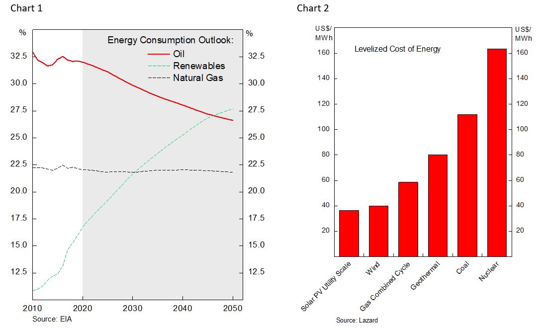 The year 2020 has seen major economies in the world affirming their commitment to limiting the increase of global average temperature to 2 degree Celsius above pre-industrial level, with a more ambitious target of 1.5 degree, as had been agreed under Paris Climate Agreement. EU and Japan would strive for a net zero target by 2050, while China is aiming for 2060. Achieving all this ambitious target requires increasing energy efficiency, decarbonization of the power sector, switching to low or zero-carbon fuels, and utilization of carbon capture technology, trends which have already started this past decade and will only accelerate (Chart 1). More importantly, all these shifts increasingly make sense from a financial point of view. In the past decade alone, energy cost from solar PV has declined almost 80% and onshore wind by 25%. Currently, levelized cost of energy – considering the total cost of building the facility and the energy produced during its lifetime – for solar PV and onshore wind power generation is lower than traditional source of power (Chart 2).