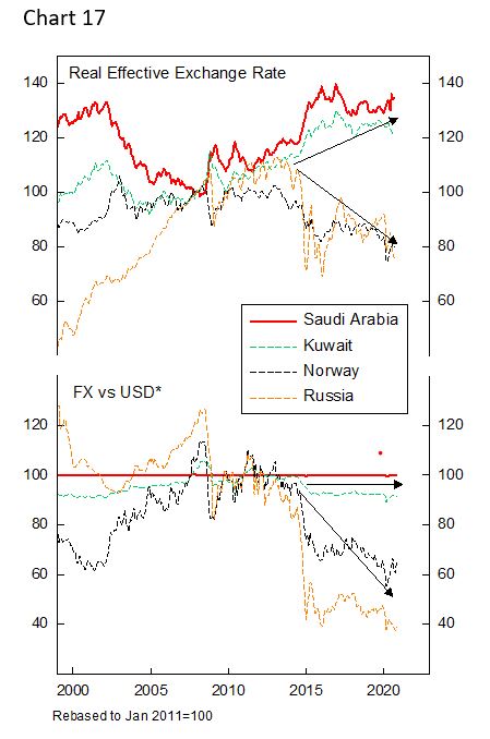 - Oil producer countries will suffer from lower equilibrium oil price as demand flattened out and more countries are shifting their power generation toward green energy (Chart 16). Price war between OPEC, Russia and the U.S. will become more often as each country tries to maximize the present value of its oil reserves. This means that currency peg in Gulf countries, such as Saudi Arabia and Kuwait, are unsustainable and will have to be devalued (Chart 17).