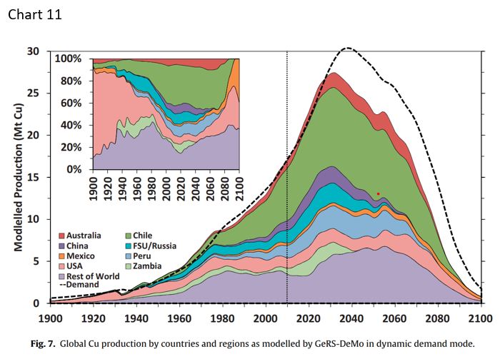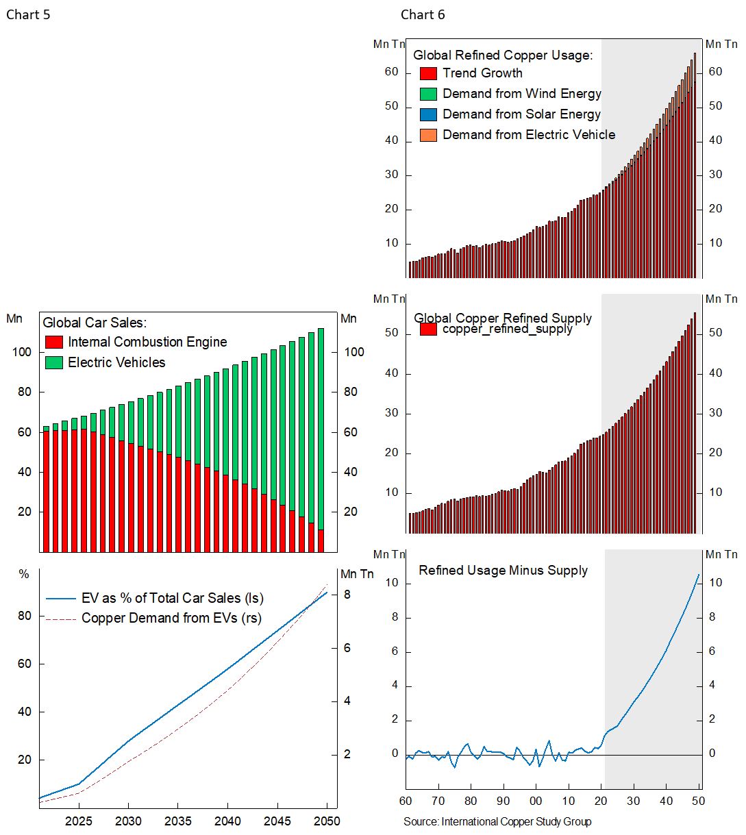 - The largest new demand for copper will come from the shift of internal combustion engine to electric vehicle, the later requiring 83 Kg of copper per vehicle vs 23 Kg for ICE. EV today accounts for only 2.3% of total vehicle production, a figure that will rise to close to 100% by the middle of the century (Chart 5). This adds 2 million tonnes additional demand of copper annually by 2030 and increase gradually to 8 million tonnes by 2050, without even accounting for the infrastructure required to support EV’s charging station and electricity distribution.