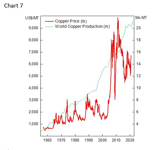 - Unlike oil, the technological revolution in extracting copper from the ground has not gone through a significant breakthrough in the past decades, which has seen increasing amount of copper has to be mined at an increasing cost (Chart 7 and 8). Production cost of copper varies between $3-6/Kg and historically we have seen copper refined supply to stop growing or even fell whenever price dipped below $6000/Ton, which have forced miners to curtail production, such as the period between 2014 and 2017 (Chart 9 and 10). Moreover, miners often mine for higher-grade ore in the beginning of the stage and go through lower grade in the later stage of production, meaning that it is more difficult and expensive to sustain production as lower quality ore being mined. All these translate to higher copper demand will only be supplied at increasingly higher prices.