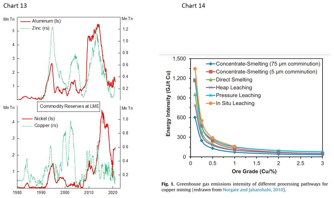 - Miners are also increasingly facing tightening environmental standard, and few have activities in geopolitically unstable countries. For instance, lower grade ore, which tend to be found in a larger mine requires higher water and energy consumption for operation and is associated with higher environmental cost (Chart 14). A global push towards limiting emissions could mean higher operating cost that is passed over to prices. In addition, the past few years have seen labor strike in Chile and Peru demanding higher pay that could further add to production cost.
