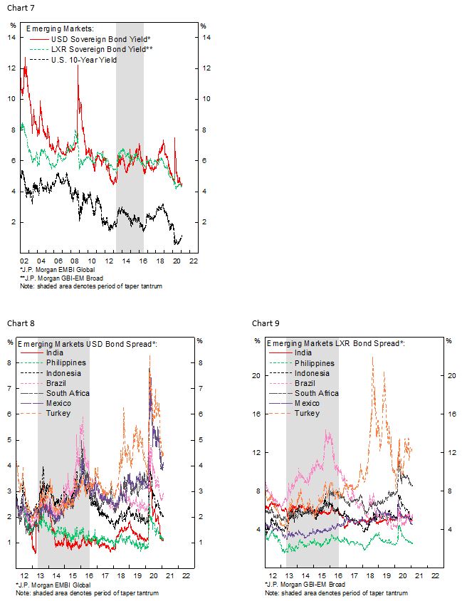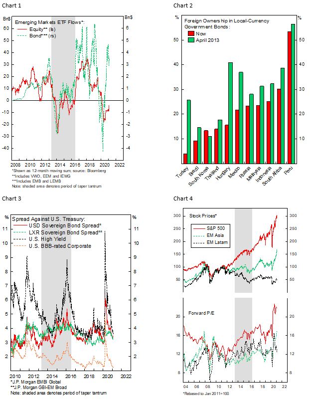 Potential for Sizable Portfolio Outflow is Limited. The period before 2013 Taper Tantrum was marked by strong capital flow into EM assets, in contrast to current situation where flow into EM bonds and equities are only beginning to recover (Chart 1). More importantly foreign ownership of EM bonds, especially for the more fragile EM countries, are now much lower than pre-taper tantrum (Chart 2), further limiting the pressure of outflow from local bond market and currency.