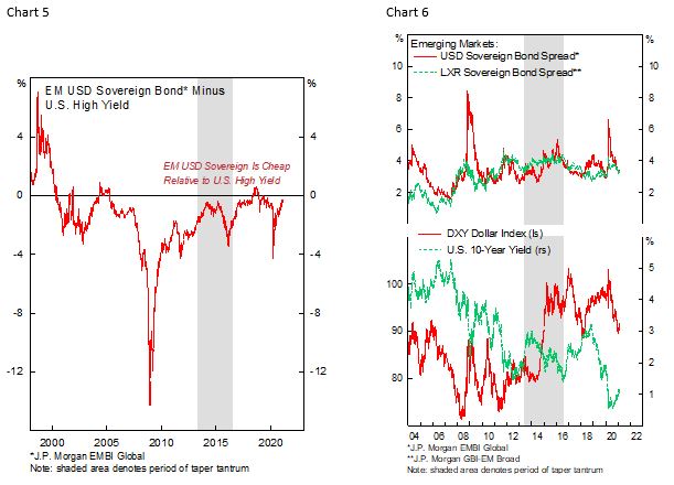A scare in the market is an opportunity to further accumulate EM bonds, as the Fed is not likely to hike rates anytime soon and EM bonds is still trading cheap relative to U.S. IG and HY domestic bond market. However, we noted that downside risk remains high for high-profile countries such as Brazil and South Africa, whose fiscal outlooks are bleak and both dollar and local-currency bond spread has already compressed significantly of late. Investors should be cautious on Latam bonds and Asian equities but maintain overweigh on Latam equity and Asian bonds, as a “taper tantrum” is likely to occur alongside strong global growth and commodity demand and a flight to safety should benefit low-yielding EM Asian bonds relative to its Latam counterpart.
