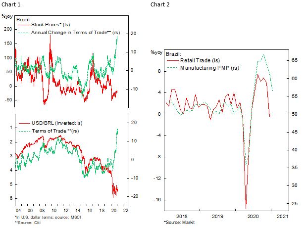 - The backdrop for Brazilian assets remains bullish amid rising commodity prices and undervalued Real (Chart 1). In addition, Brazilian economy has recovered strongly and various indicators – such as manufacturing PMI and retail sales – are now back to pre-pandemic level (Chart 2). With the global economy continue to recover and lockdown restriction likely to be eased as the number of cases decline, commodity prices should continue to rally and provide a tailwind to Brazilian assets.
