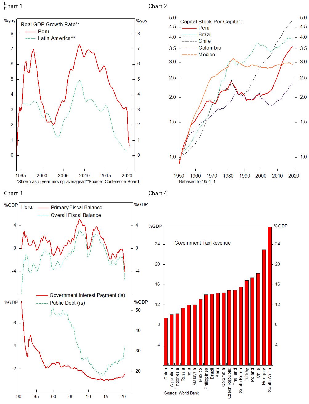 For a country in region mired by low productivity growth and constant crisis, Peru easily stands out and could be considered as one of EM countries where growth improvement is visible. The size of Peruvian economy has grown by 3.5 x in the past three decades, whereas Brazil and Mexico have less than doubled (1.8x) during the same period (Chart 1). This is partly contributed by the country’s disciplined fiscal and monetary policies that provide stability for the domestic economic and financial conditions, attracting FDI into the country and allowing faster pace of capital accumulation relative to other Latam countries that continues until today (Chart 2).