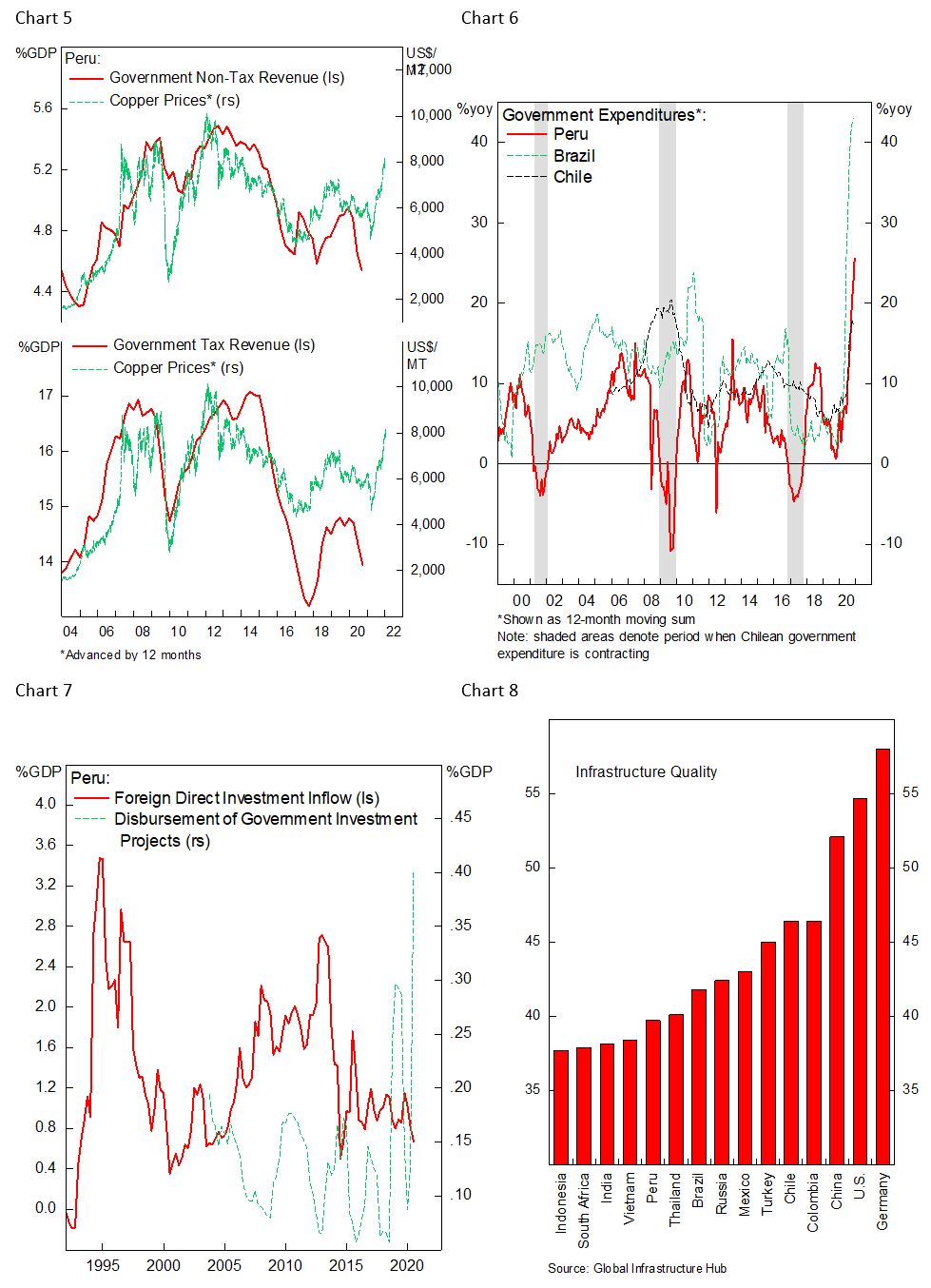 Although the deficit ceiling translates to the superiority of Peru’s fiscal health within the region, it also causes fiscal policy to be procyclical and amplify the volatility of growth that is already heavily tied to the commodity cycle (Chart 5). This means that during the downturns, not only tax and non-tax revenue will contract, but public investments and social spending also have to contract and become a drag on growth (Chart 6).