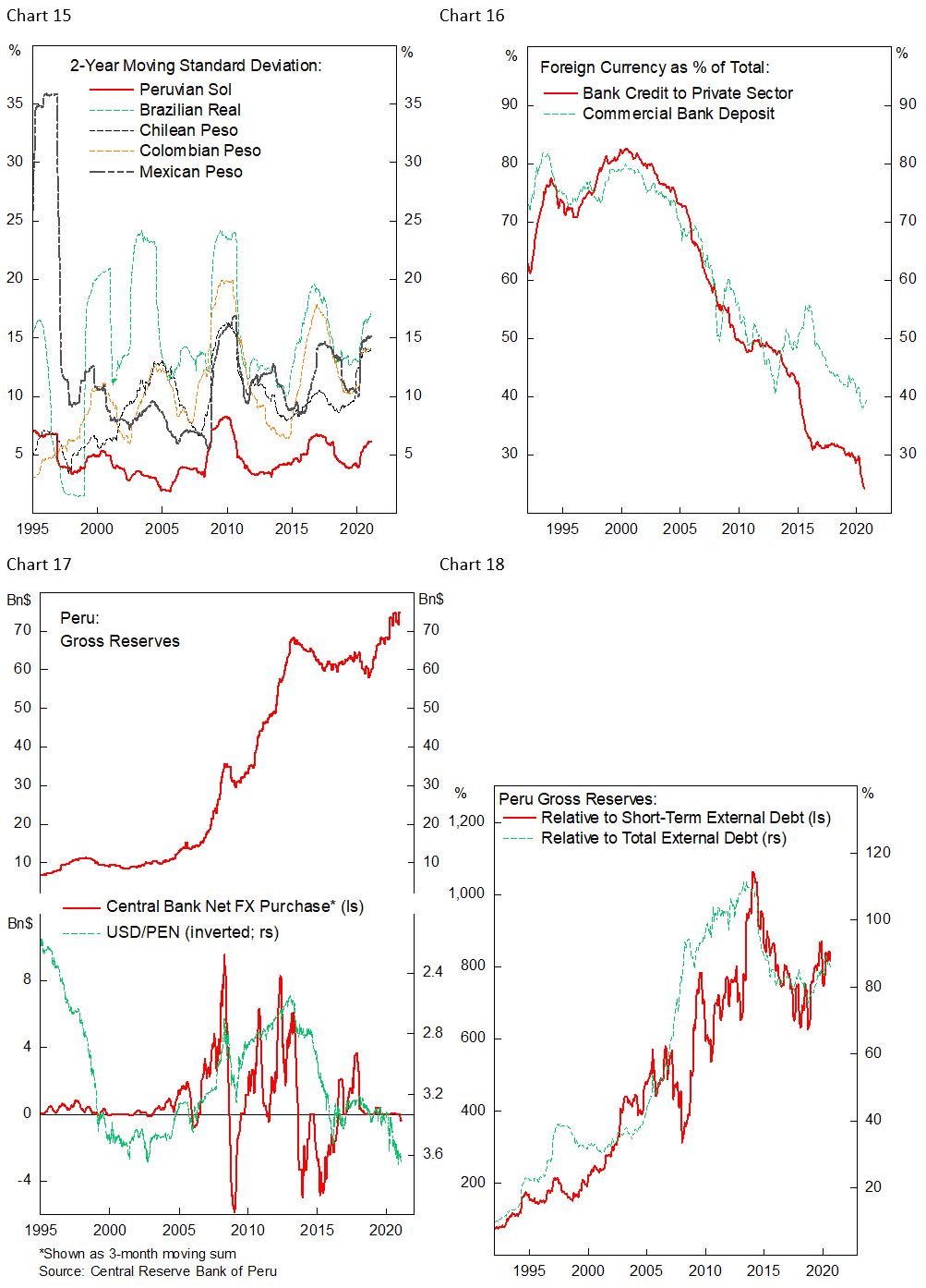 In terms of monetary policy, Peru’s managed floating regime has provided stability for the Sol and reduce the risk of currency mismatch in the financial system (Chart 15). Despite efforts to reduce the dollarization of the economy, sizable portion of Peru’s credit and deposit is still denominated in foreign currency – mainly the dollar – that increase the risk of illiquidity and insolvency in the financial system when the PEN significantly depreciate (Chart 16). This points to the necessity for the central bank to accumulate foreign-currency reserves as war chest during the downturn (Chart 17). Chart 18 and 19 show that Peru’s FX reserves has been rising relative to external debt, and its coverage of foreign-currency debt is among the highest in EM. In addition, the credibility of its central bank and anchored inflation expectation should translate to stronger domestic currency in the long run to reflect higher productivity growth (Chart 20). Our fair value assessment shows that PEN is currently 5% undervalued (Chart 21), and cyclical rebound in global growth should bolster the currency further.