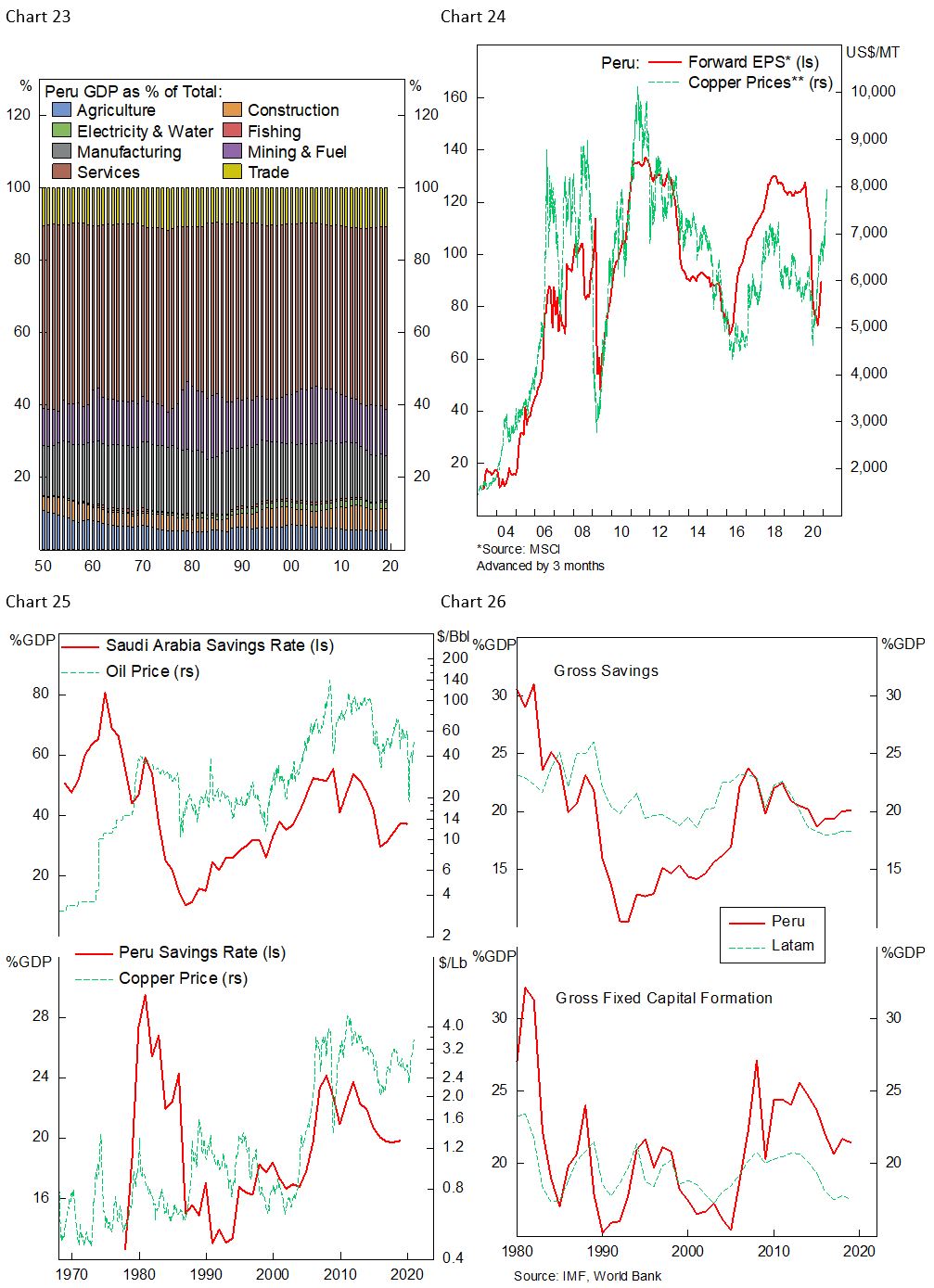 In such case, the rise in copper prices will lift domestic savings rate – similar what happened in 1980s when copper price doubled and those for gulf countries (Chart 25) – and bolster investments over the long run. The large investment needs for transportation, energy, education, and health care mean the rise in savings will not be exported out but rather be used to develop domestic infrastructures (Chart 26).