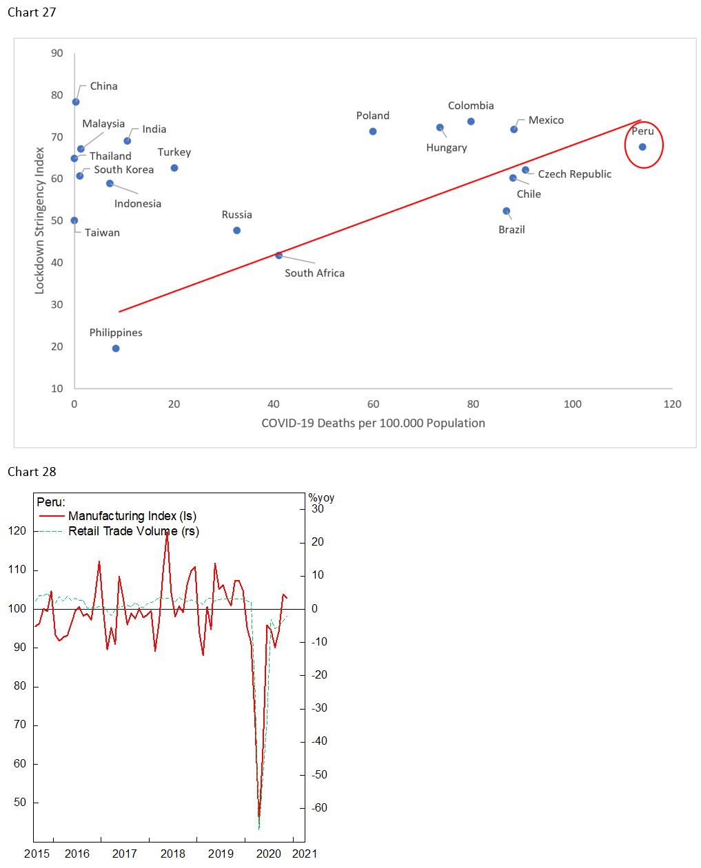 Lastly, Peru suffered the most from Covid-19 pandemic in terms of deaths per capita and economic damage (Chart 27), which make the case that a rapid distribution of an effective vaccine could help the country quickly reach the threshold for “herd immunity”, supported by the already high infection rate among large portion of the population. Currently, Peruvian manufacturing activity has rebounded above pre-pandemic level while retail trade is still slightly below last year’s level, both of which will be further aided by inoculation of the country’s citizen (Chart 28).