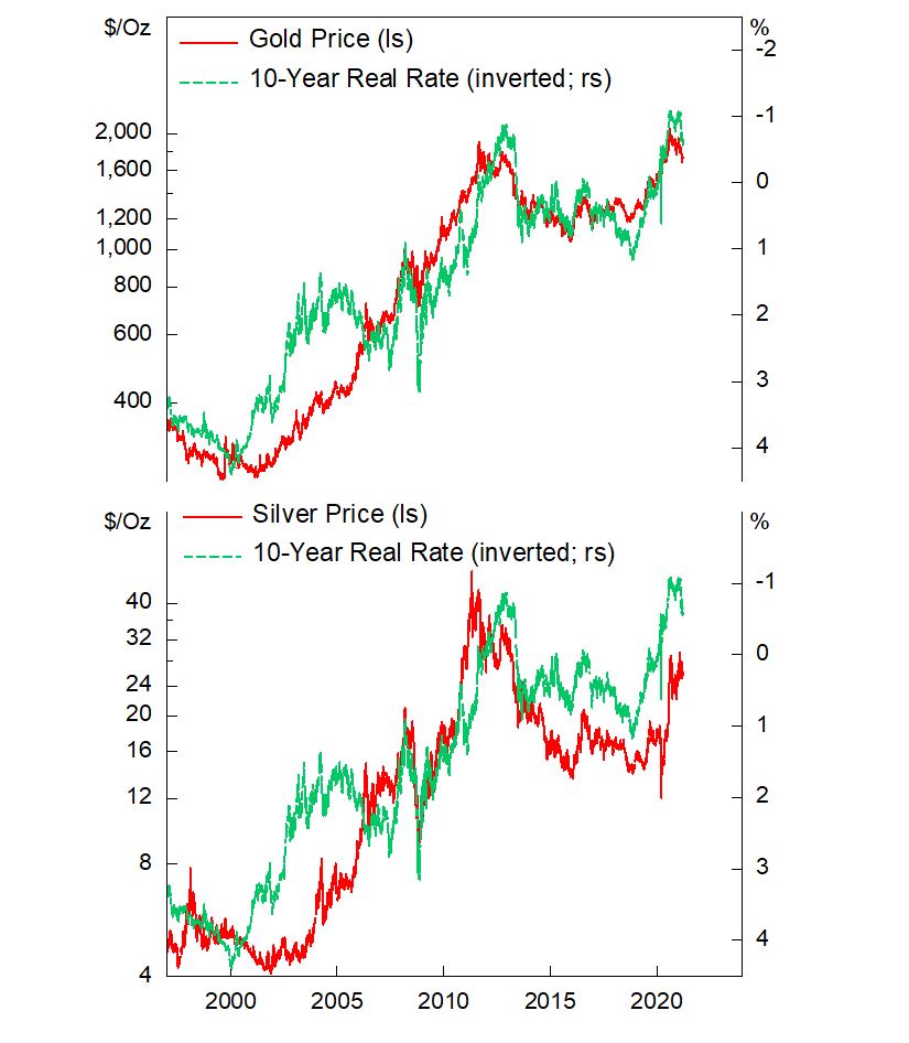 After the correction in precious metal, the overbought condition has largely eliminated, although the short-term outlook is rather mixed. On the bullish side, we are betting that Treasury yield is peaking out and will stabilize at 1.5% while inflation breakeven stays at 2.5%, resulting in real yield of -1%. This scenario would be consistent with gold at $1800-2000 range and silver at $35-40 range. However, potential rebound in the dollar could add pressure precious metal from going higher. In sum, we hold a positive medium-term outlook on both gold and silver but are warry of the spike in the dollar.