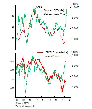 The cyclical bullish case for Chilean stocks is straightforward. Chilean earnings are set to improve dramatically from the higher copper prices, which will continue to enjoy structural boost from electrification of vehicle and green energy infrastructure demand, as discussed in a previous report. Chinese imports continue to pose strong number in recent months despite the fear of policy normalization, and President Biden’s $2 Tn infrastructure plan further bolster demand for the metal in the coming years. In addition, copper accounts for over half of Chilean goods exports and hence higher prices provide direct tailwind to the country’s trade balance and is a boon for the CLP.