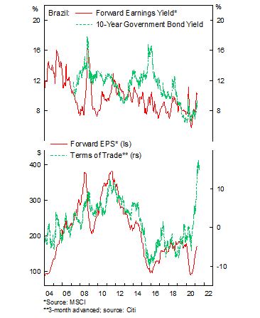 Remain slight overweight Brazilian equities. Our expectation of higher earnings for Brazilian stocks have slowly materialized in recent quarters with earnings back to pre-pandemic level, and we are still expecting further gain in earnings in the coming months, driven by the rising soybean and iron ore prices that translate to a massive improvement in the country’s terms of trade.