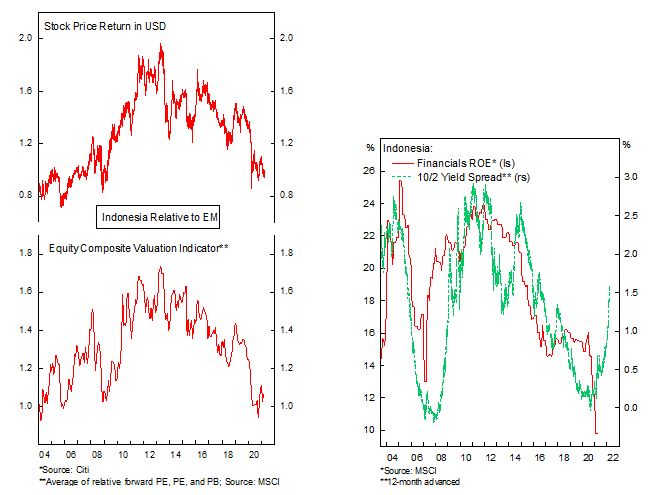 Indonesian stocks have so far lagged the recovery in asset prices and the country’s valuation is now comparable to the EM benchmark, near the low end of its two-decades trading range. First, unlike energy or material firms, which directly benefit from rising commodity prices, banks – which accounts for half of Indonesian stock index – tend to lag the recovery but should catch up in the coming months.