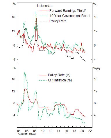 Finally, we are betting that Indonesian local-currency bond yields to fall, which should also push equity multiple higher (or forward earnings yield lower). At 5.5%, the real 10-year sovereign yield of Indonesian bond is very rich, even if investors want to hedge the currency exposure.