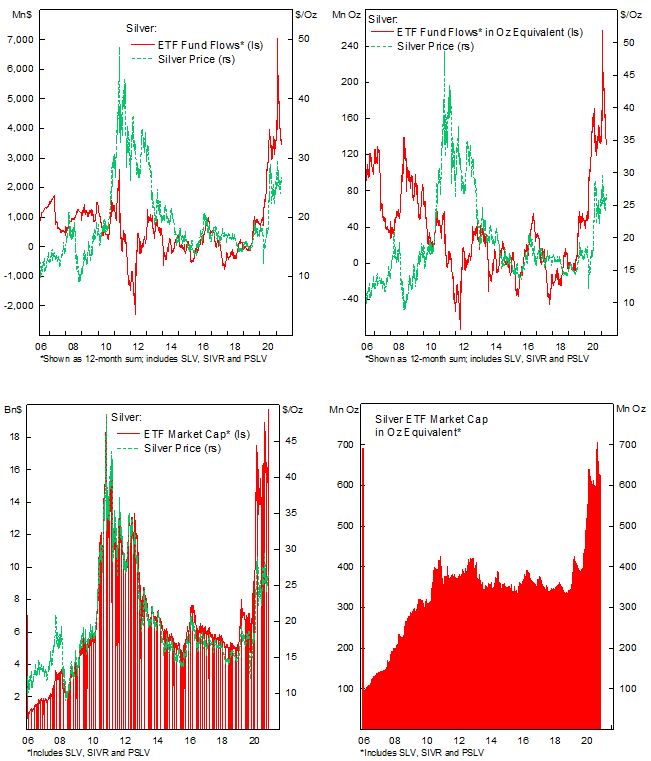- Long-term Treasury yields are peaking out as Fed reiterate its dovish stance and brush off the potential for permanently rising inflation amid strong U.S. domestic recovery and large fiscal spending planned by the Biden’s administration. The market is still pricing significantly more hawkish projection of Fed policy rate hike and we believe 10-year yield will slide towards 1.2-1.4% in the coming months. This, combined with 10-year inflation breakeven rate at 2.5%, should propel silver prices to above $35/Oz.