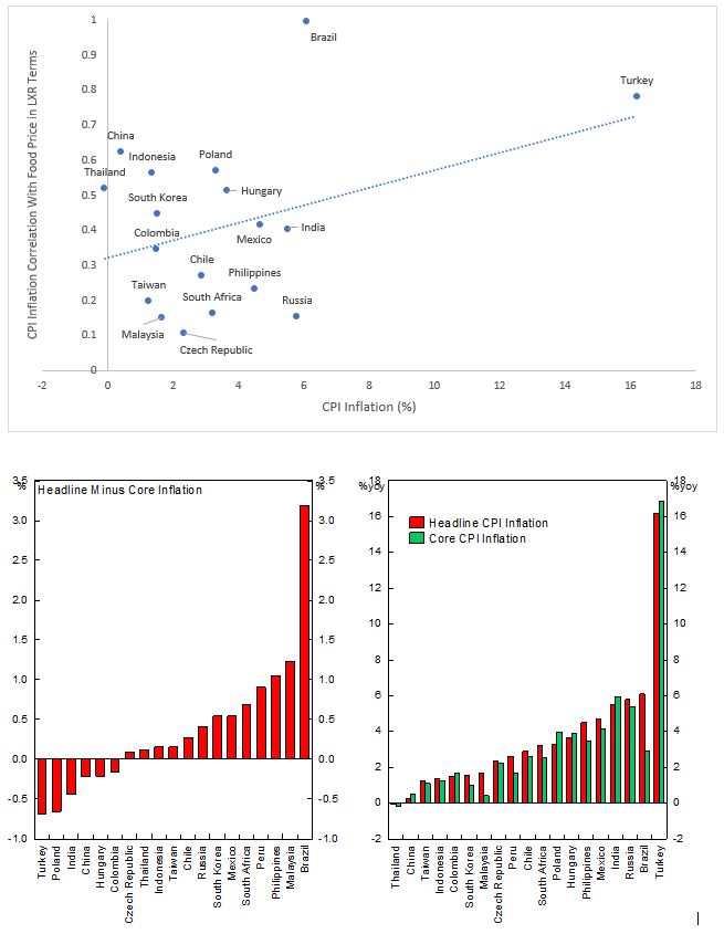 - The rise in inflation has been fueled by rising food and oil prices instead of broad-based core goods and services. Last year’s oil price slump drives down transport cost for EM countries, which also dragged down headline inflation (see charts on Brazil and India). As economic activity normalizes and oil prices recovers, transport price inflation suffers this year from abnormally low base effects, which will moderate in the coming months.