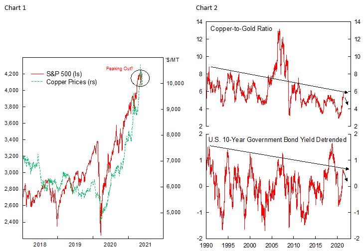 Blow-out number of various economic indicators coming in the past weeks – PMI, retail sales, inflation – suggest that the global cycle is peaking out and the strongest period of growth is in the rear-view mirror. In the short-term, the risk assets rally that began in March 2020 is likely to take a breather or even correct from currently overbought level. S&P 500 and copper prices have refused to go up despite the strong number coming out of U.S. and China in recent days (Chart 1), most likely amid the fear of hawkish policy guidance from the Fed – which some members finally thinking about the timeline for tapering its QE program – and contraction in Chinese credit impulse, which has historically been a precursor to major growth slowdown with significant impact to commodities and global risk assets.