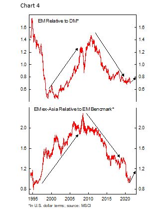 In addition, the policy shift in both China and U.S. has also been gradual and communicated well in advance, while liquidity remains easy. This time around Chinese policy tightening has been less harsh compared to previous cycles – short-term rates have been falling despite the decline in credit impulse and diverged from the rebound in both the economy and stock price (Chart 2) – and outright tightening in the U.S. will not happen anytime soon. Globally, policymakers concern on various issues – flare up of infection cases, high unemployment rate, rising food prices, and social instability – means policy support is unlikely to be withdrawn abruptly. This, combined with a still favorable global growth outlook for the second half of the year should translate to capital flow going back to EM assets and for lagging countries to catch up (Chart 3).