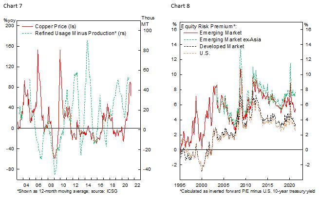 More importantly, EM ex-Asia valuation is still cheap, and rolling global recovery – from China, U.S., now Europe, and potentially EM after – means commodity demand and price should remain firm, which bodes well for the earnings of resource-rich nations. Despite this, market enthusiasm remains muted, with EM ex-Asia trading at 24% discount relative to EM benchmark based on forward earnings multiple (Chart 6, bottom panel) and equity risk premium has not come down in-line with its EM and DM peers’ trajectory (Chart 8).