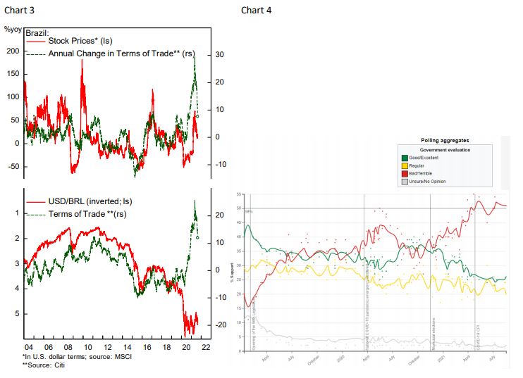 Lastly, President Bolsonaro’s erratic behavior will likely persist until the election in October next year and push risk premium higher. His popularity continued to decline amid the poor management of the pandemic, corruption allegation on his family, and efforts to dismantle the country’s democratic institutions. Recent polls show that his disapproval rating has risen to above 50% (Chart 4). Already President Bolsonaro is laying the groundwork for a voter fraud allegation should he lose next year’s election. He has insisted on using paper voting receipts for the election, a proposal that failed to pass the three-fifth majority threshold in Congress last month. In addition, the president is currently on probes over unfounded election fraud claims that could result in him being disqualified from running next year. The alternative, however, could mean former President Lula da Silva from the left-wing Worker Party winning, under whom Brazilian fiscal expenditures were rising rapidly and eventually culminated into 2015 fiscal crisis.
