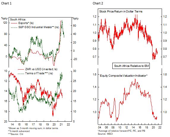 The not so bad thing about South African growth outlook is that commodity prices remain high despite the recent correction. Improving terms of trade over the past year is a strong tailwind to equity earnings and the rand, allowing South African equities and currency to maintain their cheap status despite the rally (Chart 1 and 2). In addition, it is among the few fragile countries in EM that is not experiencing a spike in inflation, allowing the central bank to avoid an abrupt reversal in monetary policy and to support growth (Chart 3). However, greater volatility of the rand and higher weight of material sector in South African benchmark mean historically it suffers during growth downturn – which we expect in the coming 3-6 months.