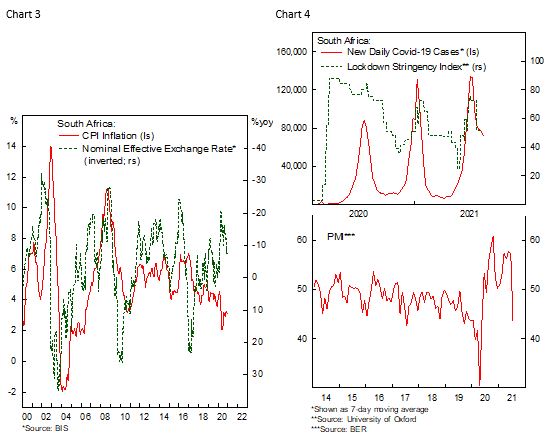 The bad includes poor pandemic management that exacerbate anger towards the government, and poor political landscape and infighting within the ANC, both of which contributed to the unrest last July. The still concerning spread of covid-19 in the country, low vaccination rate and damages from the looting all point to a weak economic recovery this year (Chart 4).
