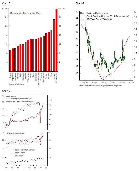 - However, being different to Brazil where tax revenue is only 14% of GDP, South African government revenue is double that and is among the highest in EM (Chart 5). The fact that South African government is still running a huge fiscal deficit highlights the enormous burden on the state to maintain social spending for the unemployed mass, leaving few resources to spend on investment.