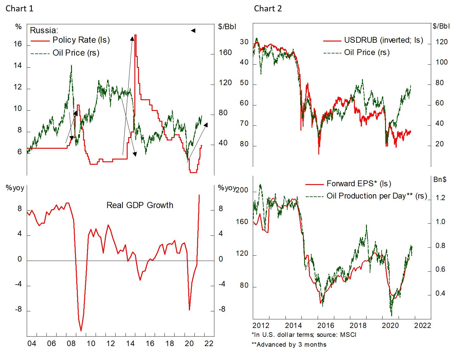 - Aggressive monetary tightening will bolster the Ruble and should not hurt the economy significantly as it benefits from the trickle-down effect of higher oil prices. Previously the country was forced to tighten policies at a time when oil prices were collapsing, which results in a sharp contraction of the economy (Chart 1). This time around, elevated oil price should ease the downward pressure from higher borrowing rates.