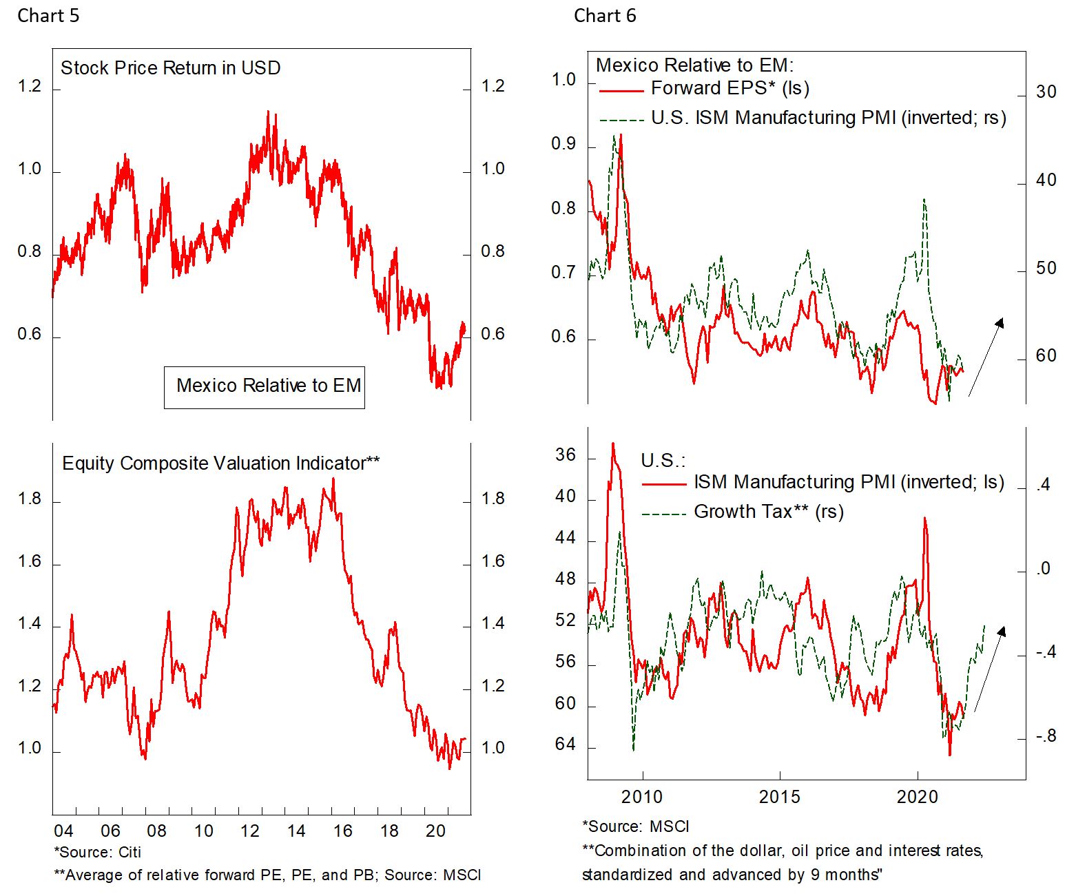 - Taken together, multiple expansion and earnings of Mexican stocks will likely become a structural tailwind for Mexican outperformance in the years to come. For next quarter, however, we remained cautious as we expect volatility of risk assets to remain high.