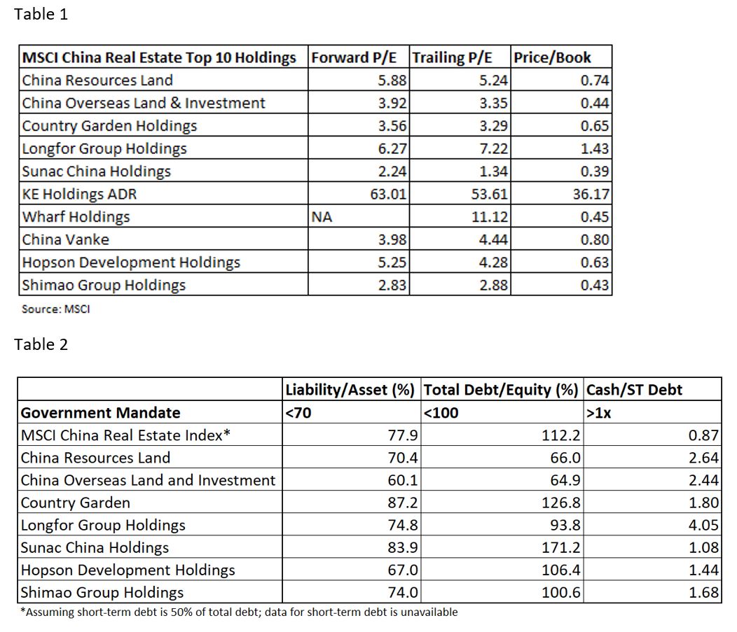 Majority of Chinese property developers has an inherently high leverage that violates Chinese government “three red lines” and may not survive a prolonged downturn in the sector. Table 1 shows that in August, among the top 8 developers listed in MSCI China Real Estate sector, four of them have cash to short-term debt ratio less than two and both their bond and stock prices have wobbled. In fact, the whole sector is trading at a distressed forward earnings ratio and valued below book value – highlighting the going concern issue for the whole sector (Table 2).
