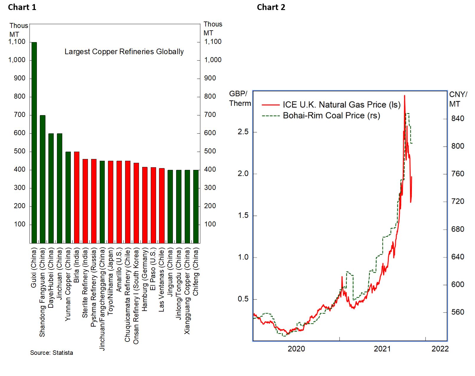From supply-side perspective, the outlook for copper price hinges on whether China’s electricity shortage will moderate. In the shorter term, the pause in the surges of coal and natural gas prices seems to point to the peak of panic buying period. As Chinese government scramble to secure energy supplies, it is likely that coal and natural gas price will move lower, and metal-processing activities will resume (Chart 2).