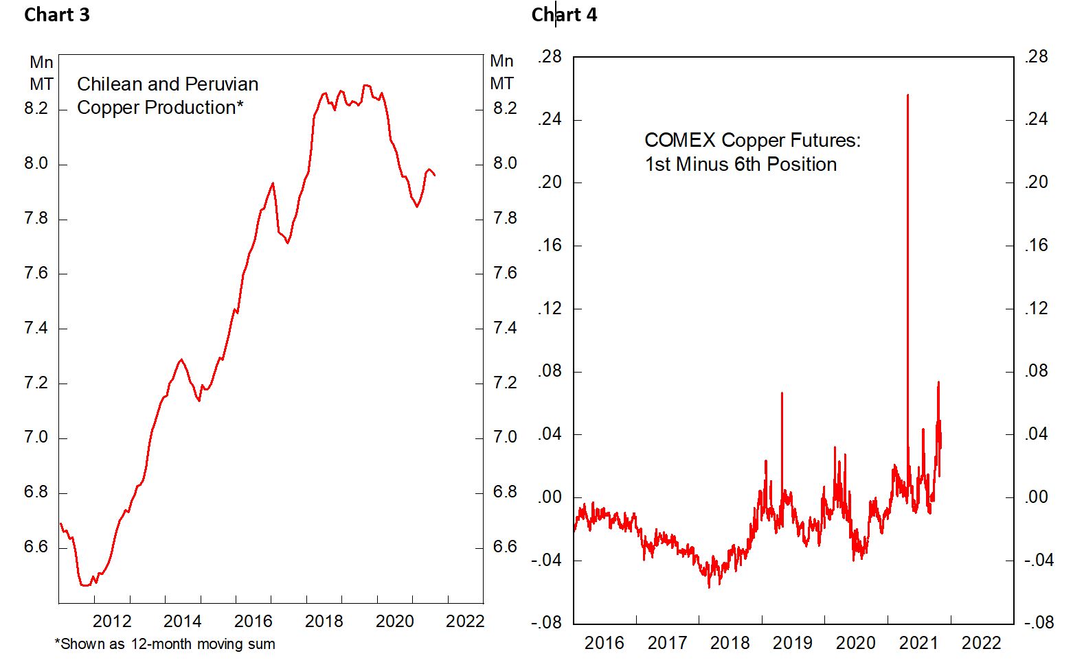 More importantly, Chart 3 shows copper production volume in Chile and Peru – two largest global copper producers – have held up well and started to rebound from the pandemic-related closure. The market seems to expect the cut off in copper shortage to be short-lived and that supply will improve in the coming months, as highlighted by the record high backwardation level in futures curve (Chart 4).