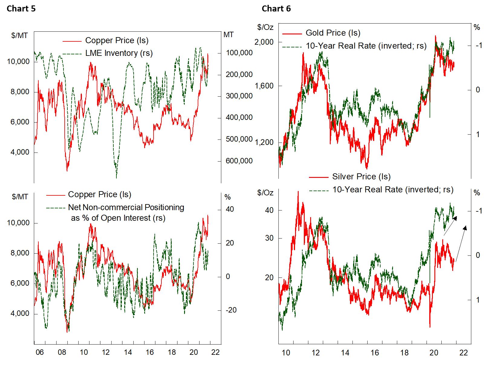 Copper inventory has been declining amid the pandemic-related mine closures at a time when consumer demand for electronics is robust and China’s post-pandemic recovery was rapid. In short, the pandemic did not significantly alter copper consumption for 2020 and 2021 but translated to lower supply, forcing a drawdown in inventory to fill the gap (Chart 5).