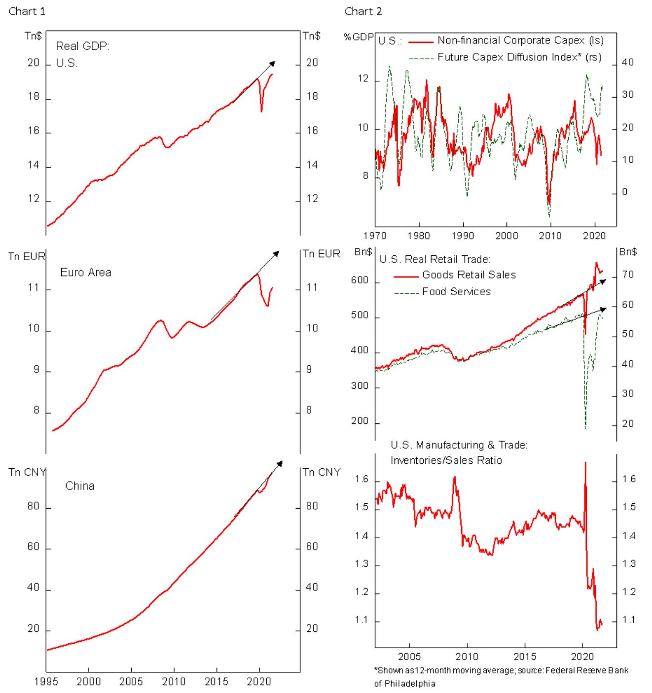 Despite the apparent boom in global economy, however, U.S. GDP today is still 3-5% lower relative to pre-pandemic trend, while Euro Area GDP has yet to recover to per-pandemic level and is probably still 8-10% lower compared to its trend growth (Chart 1). China is the only country that has already catch up to its pre-pandemic trend, although this has been driven by strong export demand rather than robust domestic demand. All these mean that although growth will continue to decelerate in the coming quarters, it will likely remain above trend in the U.S. and Europe. The bullish case for Chinese economy is uncertain due to the government active policy to reign its over-levered property sector and slowdown in its export demand due to normalization of the share of goods and service consumption. Look for the change in China’s policy makers sentiment.