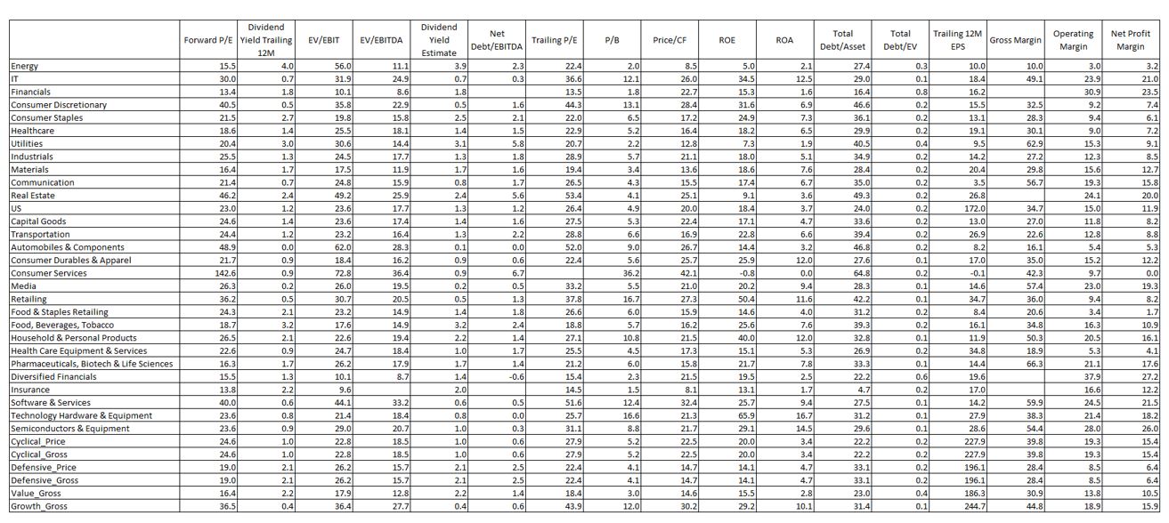 - IT includes Microsoft (34.7x), Apple (31x), NVIDIA (60.3x)