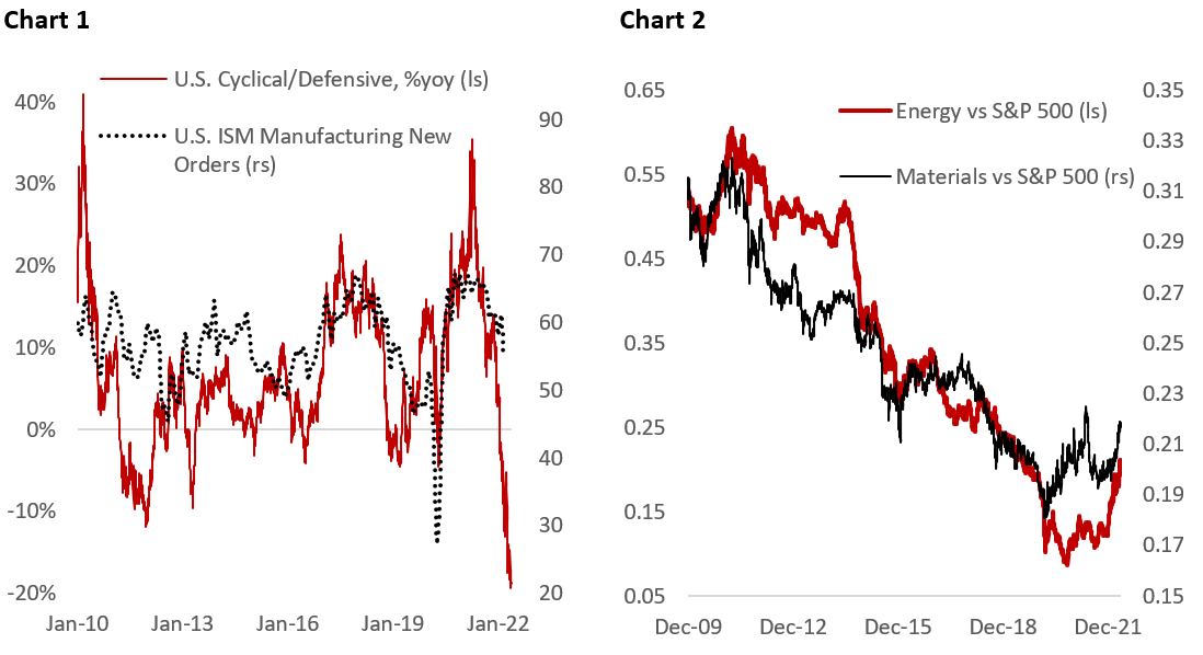 - Cyclicals have led the correction whereas defensive sectors such as consumer staples and utilities have performed relatively well (Chart 1), which reflects market concerns that the Fed will have to send the economy towards recession to curb inflation. Moreover, certain subsectors of cyclical sectors, such as automobile, has been hit hard by the supply-chain bottleneck and the war in Ukraine. High-multiple growth stocks in consumer discretionary sectors that are highly sensitive to changes in long-term yields further weigh down the performance of cyclicals relative to defensives. As a result, capital has been migrating from cycle-sensitive sectors to lower-beta one, as will be discussed below.