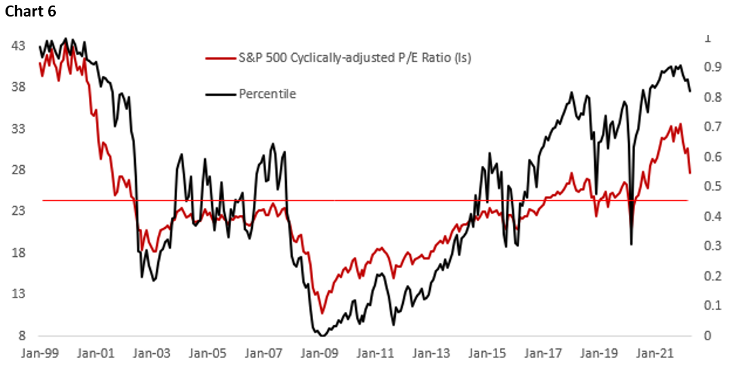 - Valuation has also been an important driver in demarcating the size of correction across equity sectors. Generally, we are seeing valuation multiples coming down for most sectors as monetary condition tightens, with those starting with higher multiples at the beginning of the year suffering more. For instance, despite already significantly underperforming the benchmark, consumer discretionary and IT are still expensive, according to the cyclically adjusted P/E ratio (Chart 3 and 4). We see both sectors trading sideways before resuming their downward trajectory relative to the benchmark. On an index level, we are targeting S&P 500 to trade at 23x (CAPE), its historical average since early 1999 and 55th percentile, which would imply another 15% correction from current level (4030 at the time of writing).